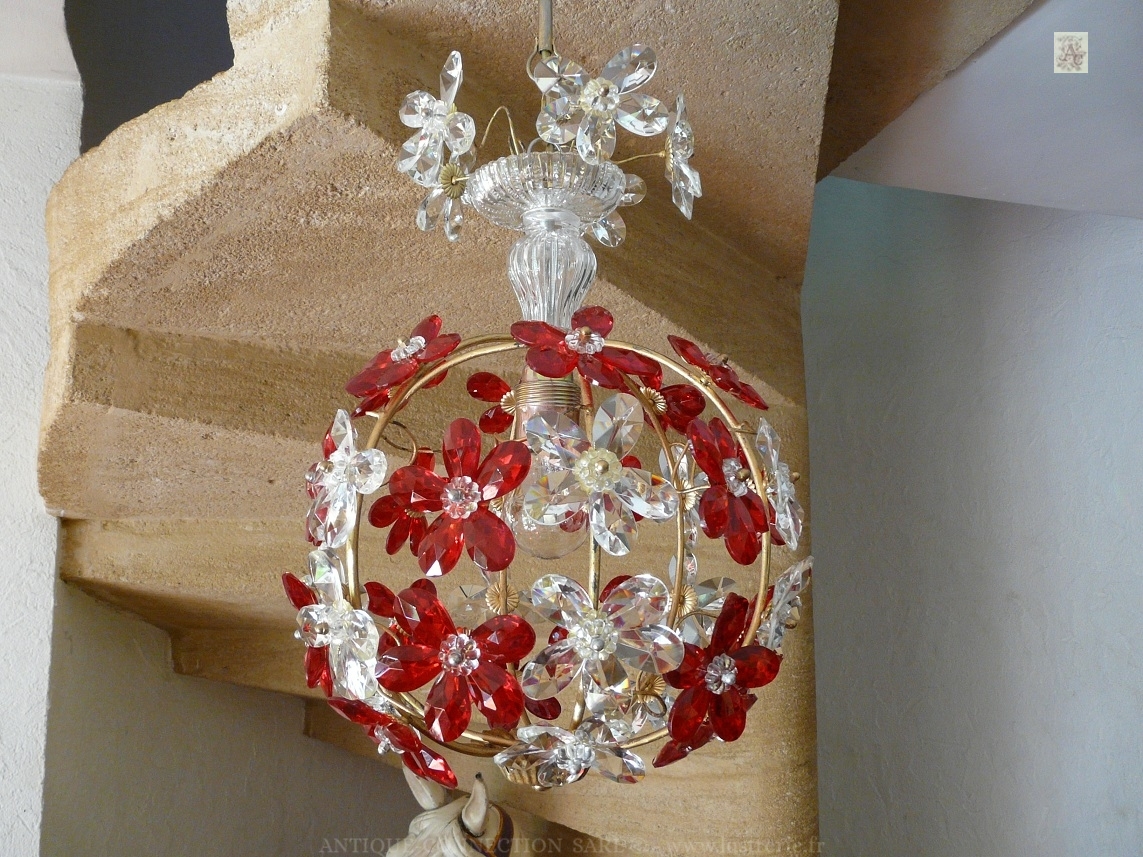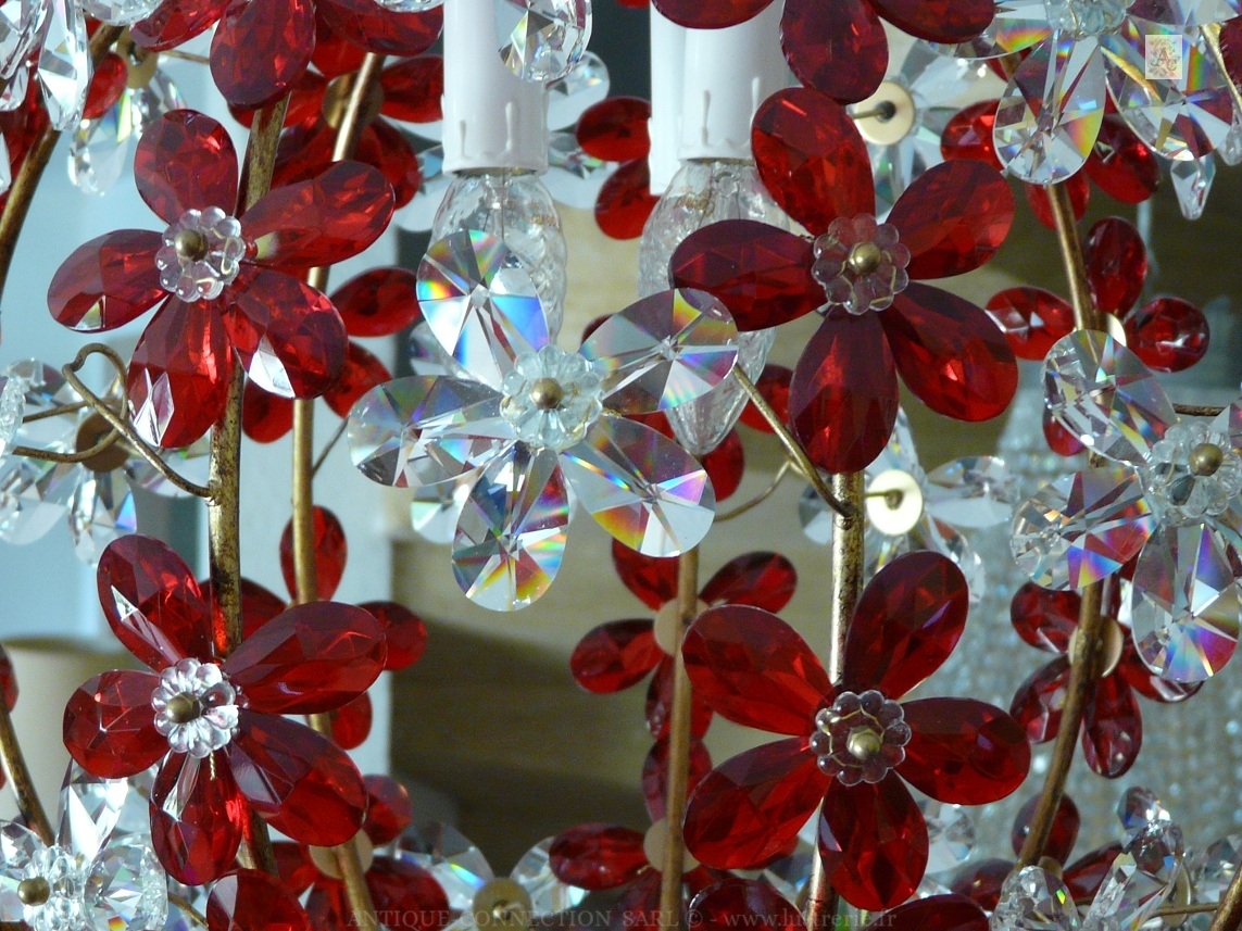 Apportez une touche de charme et d'élégance à votre intérieur avec ce ravissant lustre cage à pampilles, entièrement confectionné en cristal supérieur de Bohême.Ce luminaire est orné d'une multitude de marguerites rouges, avec la possibilité de choisir la couleur selon vos préférences.Il est également disponible sur mesure, avec une finition dorée ou argentée, pour s'adapter parfaitement à votre décoration.